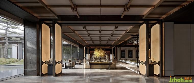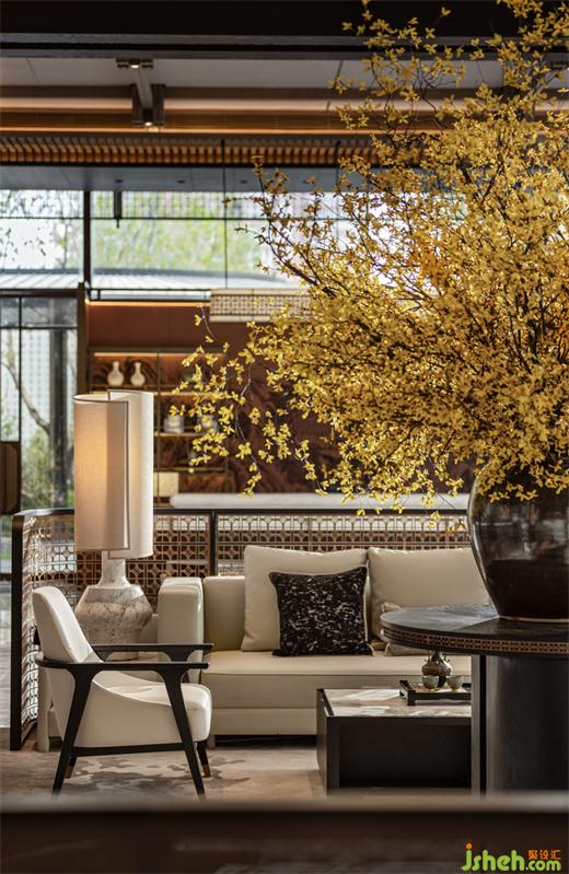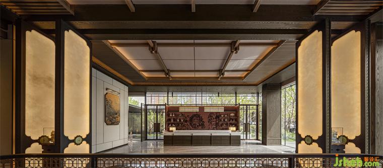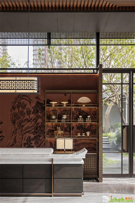 營銷中心設(shè)計對稱均衡的空間布局與古都中軸線交相輝映,黑木以翠綠如玉的石紋點綴,暖光映襯下,盡顯溫潤文雅之風(fēng)。