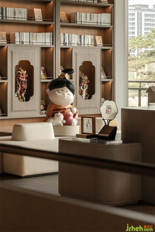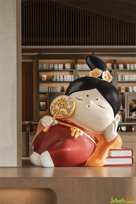營銷中心設計以唐人宮樂圖為靈感由來,引用“唐朝胖妞兒”的形象元素,融入展示區(qū)為形象雕塑展示,在趣味形象下,打造寓教于樂的生活社區(qū),進而描繪出一位唐宮娃娃進入書院學習娛樂的場景。