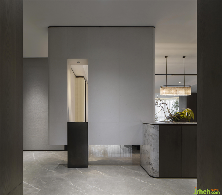 To match the large scale of the horizontal space, the vertical space is free from superfluous decoration, with a soft streamlined shape and partial stacking form, retaining the overall space's atmosphere and simplicity without losing the aesthetic tone of texture.