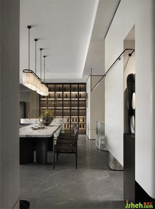 空間不是恒定的,而是可流動的。樣板房設(shè)計(jì)在空間形態(tài)上,我們賦予更多維的可能性。島臺,用懸空結(jié)合屏風(fēng)的設(shè)計(jì)演化,東方的內(nèi)斂氣質(zhì)與當(dāng)代審美相結(jié)合,隔而不斷,留給空間更多的想象和延伸,情緒在其中自由流動。