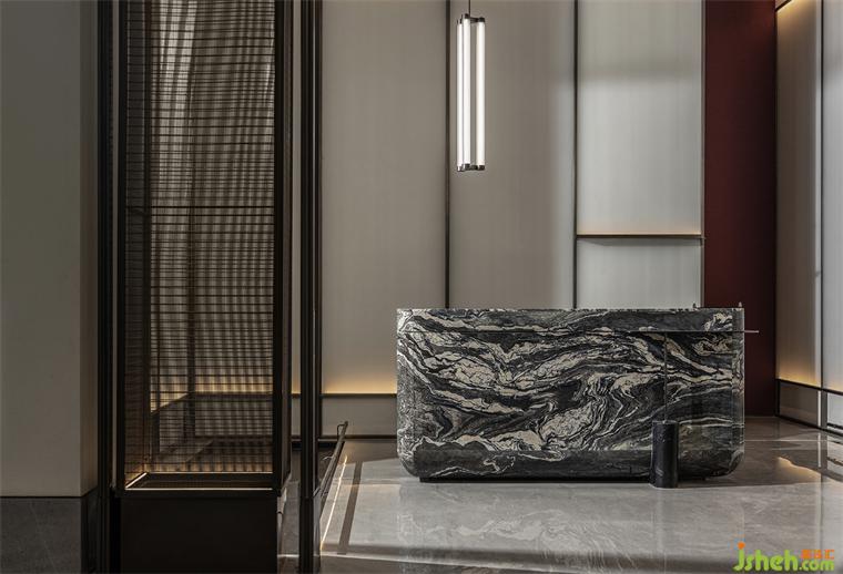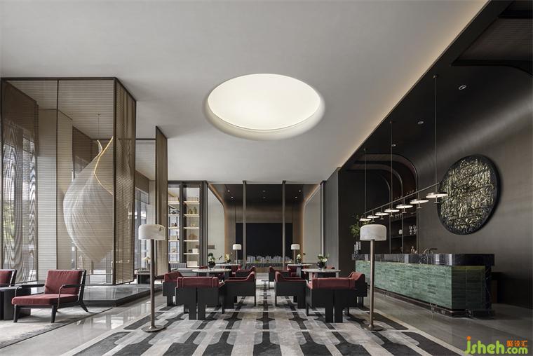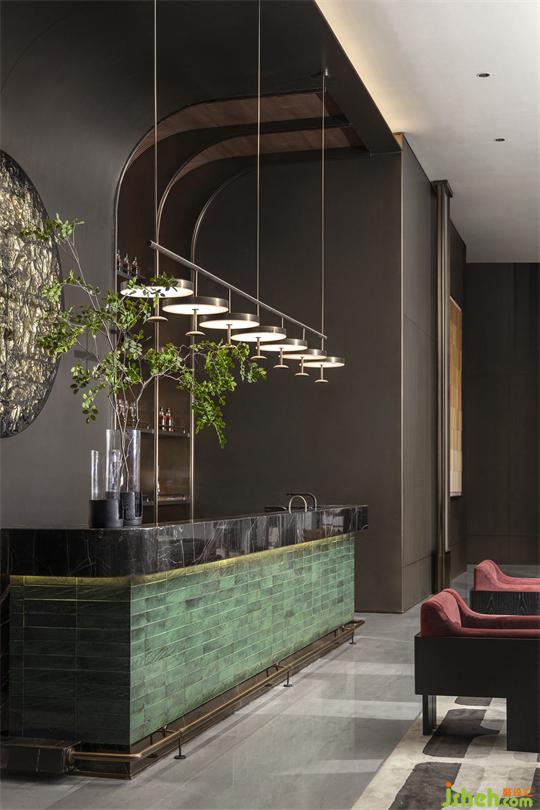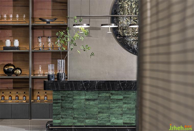 水吧主材提取了當?shù)劓闹莞G的工藝及色彩打造的手工磚,金屬網(wǎng)與古銅色層板,售樓處設(shè)計用材質(zhì)的肌理營造多元、多層次造型,傳統(tǒng)技藝與當代審美在此相融相生,散發(fā)出新生的力量。