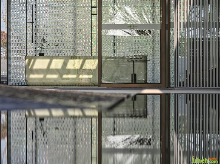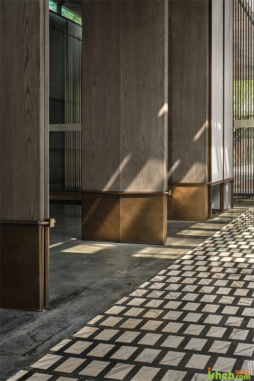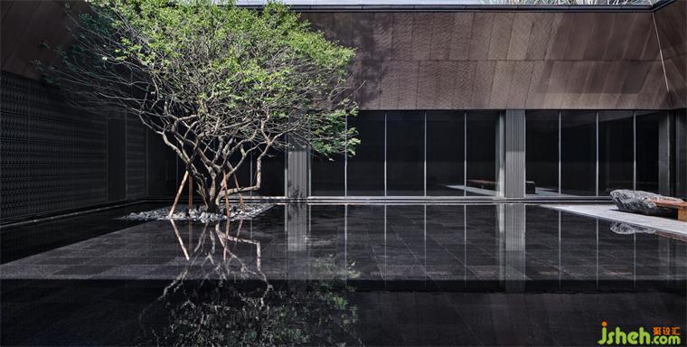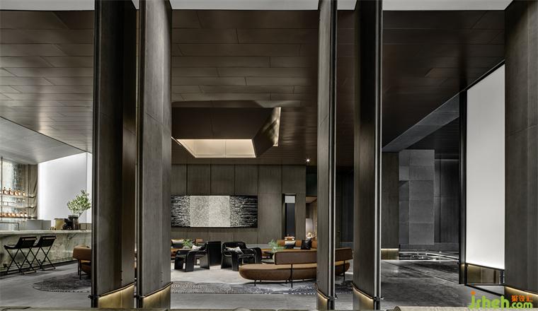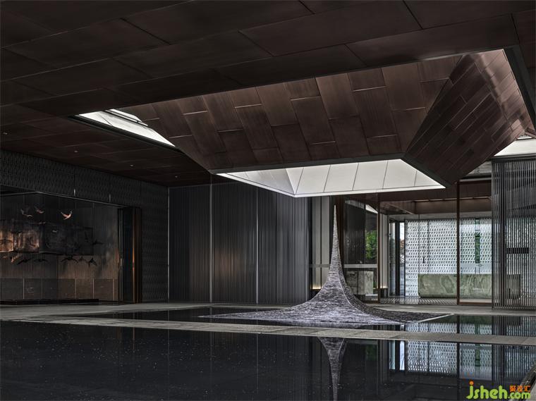 巷院的調(diào)子是流動(dòng)的,與自然、與人間煙火都是相通的。左右兩側(cè)以木飾面屏風(fēng)和亞克力斷隔,同時(shí)以山水紋理石材作為體塊穿插,讓空間猶如是一個(gè)風(fēng)景容器。生活藝術(shù)館設(shè)計(jì)水景透過(guò)格柵與水晶亞克力背景交相輝映,而光則透過(guò)“天井”傾瀉下來(lái),消弭了建筑與自然的界限。