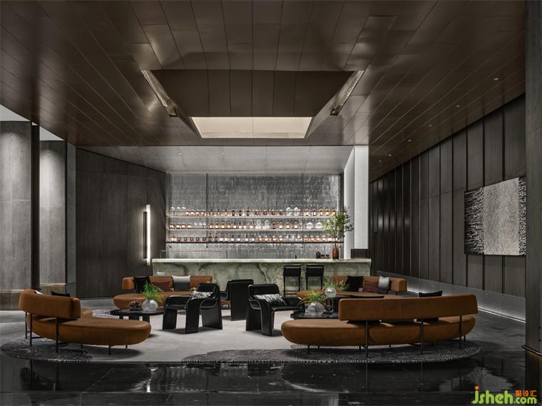 用大面積的棕色屏風(fēng)營(yíng)造山巒的形勢(shì),生活藝術(shù)館設(shè)計(jì)將山脈之態(tài)和人文之色融入設(shè)計(jì)中,整體的顏色以深色的大地色為主,輔以綠色和橙色點(diǎn)綴,清新雅逸的青色山水石與銀箔水紋質(zhì)感的吧臺(tái)背景,模仿自然的手法,深淺之間、光韻之中,自由踱步。