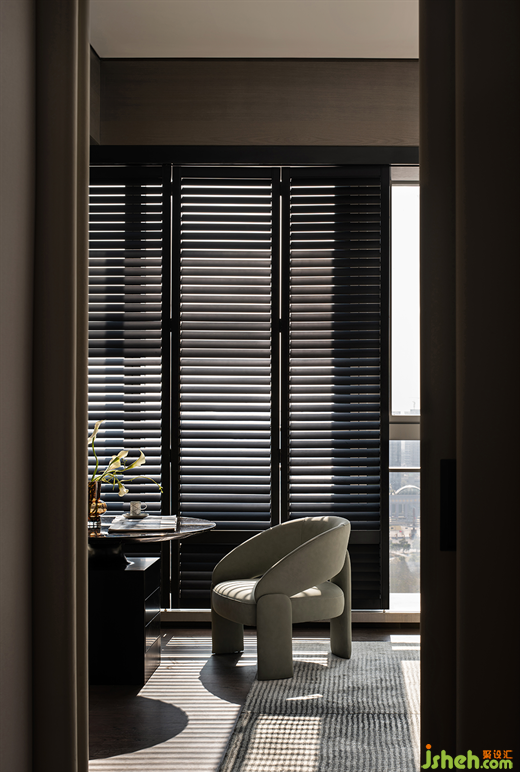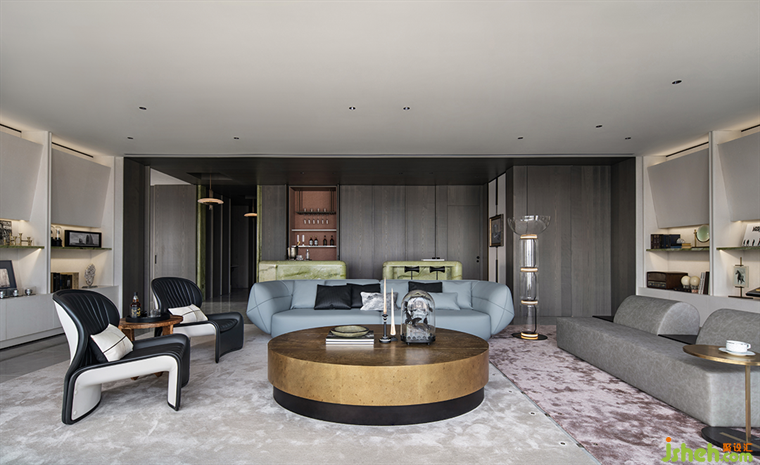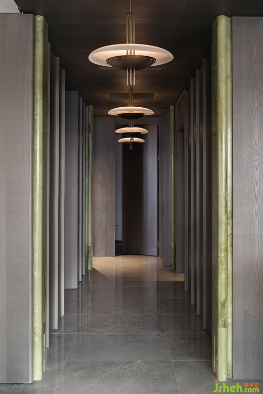 走廊的吊燈,是對黑膠文化的致敬,經(jīng)典的片狀線條和復古的造型,樣板間設計仿佛置身于那個時髦摩登的年代。隨即,畫風一轉,此刻的你,似乎又化身成了桃花源記的主人公,沿著走廊,由外而內深入。