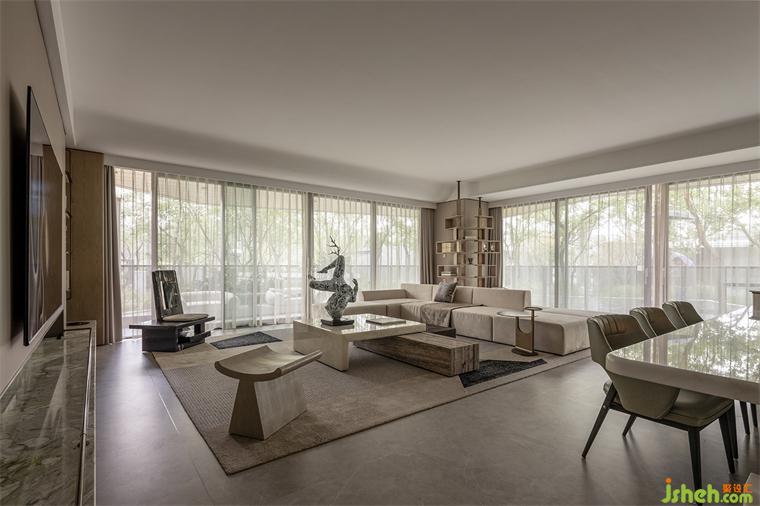 The furniture modeling of the space weakens the practicality and emphasizes the concept, so that the overall space temperament is not like the traditional space, but more a sense of abstraction. At this time, the placement of a figurative artwork breaks the sense of distance in space and adds a humanistic temperature.
