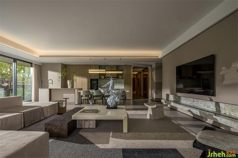 The space is crisp and concise, emphasizing the sense of mass and architecture. Seemingly casual design, but everywhere is ingenious, with different marble evolved into different parts of the space, the color and texture of the stone intertwined, in a beam of light, telling the story of the space, quiet, calm, rich power.