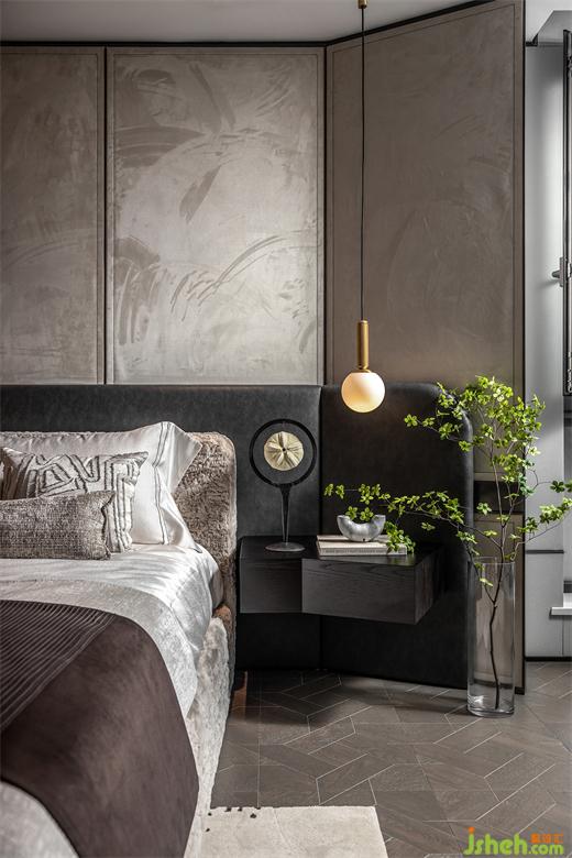 臥室對品質(zhì)極致考究,用深色調(diào)的基底,搭配麂皮、皮革、絲綢、實木的組合變化,蘇州樣板房設(shè)計營造空間層次與韻律,寬屏的床背與空間藝術(shù)品、硬裝塊面之間的肌理呼應(yīng),散發(fā)出儒雅的中性魅力。