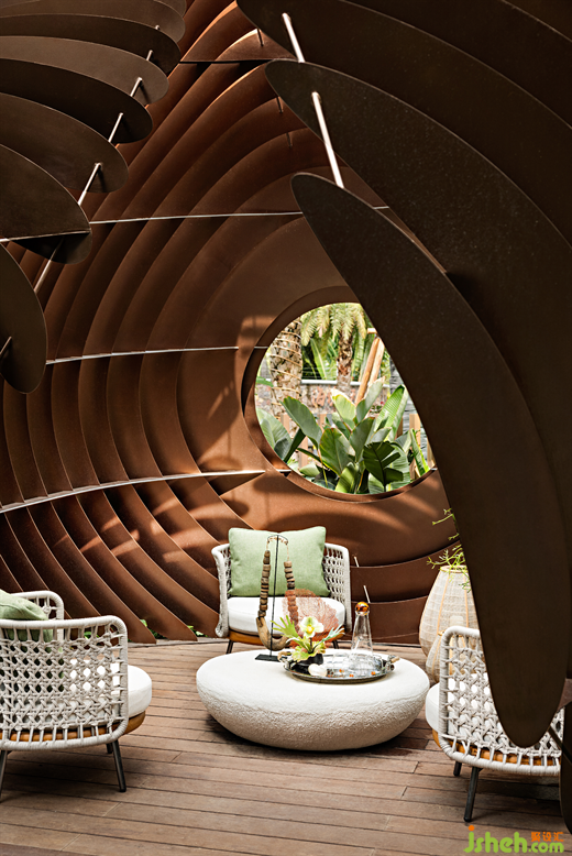 售樓處設計選擇回避直線的參與,將連綿的波濤化為流動曲線,在韻律中南洋復古的浪漫繾綣,匆忙的節(jié)奏融化在熱帶風情的明媚中。