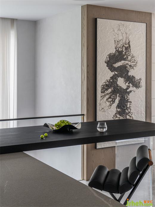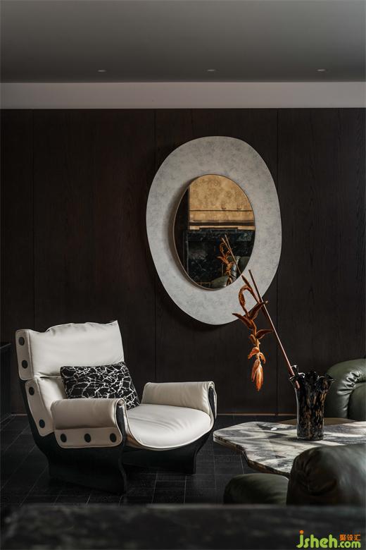 在簡約的格局中,細節(jié)藏在不起眼的地方。塊狀的幾何茶幾、形如裝飾柜的落地燈、虎紋提花天鵝絨的定制坐凳,每一個細節(jié)既低調(diào)又大膽。正是知道如何準確地將圖形、色彩、斜線引入平靜的空間里,賦予了空間宜居又散發(fā)風格和品質(zhì)感的內(nèi)核。