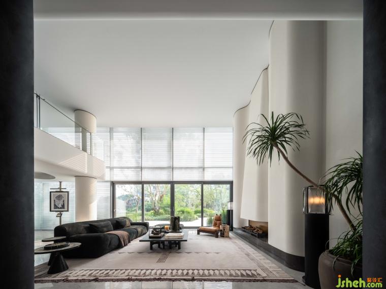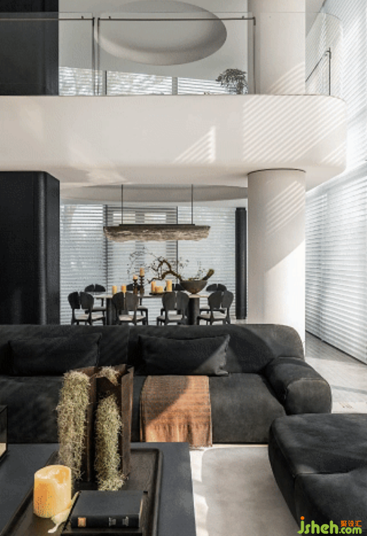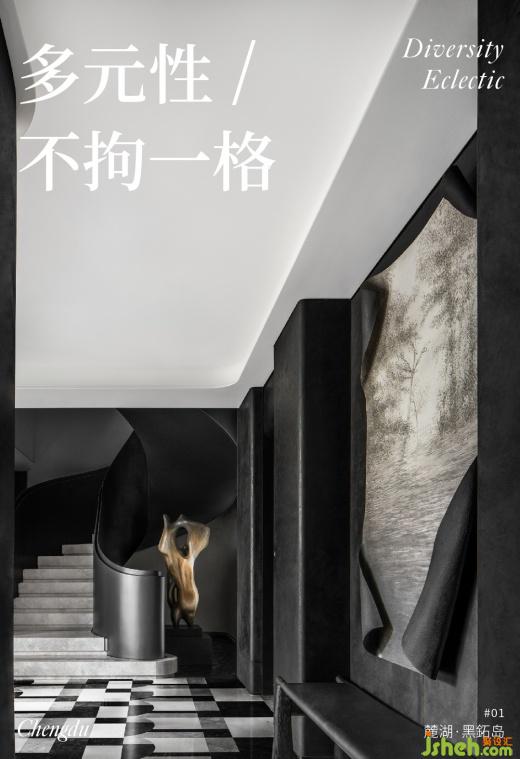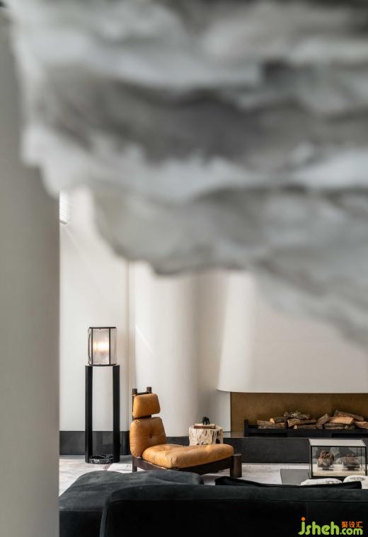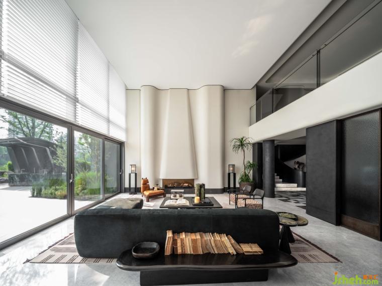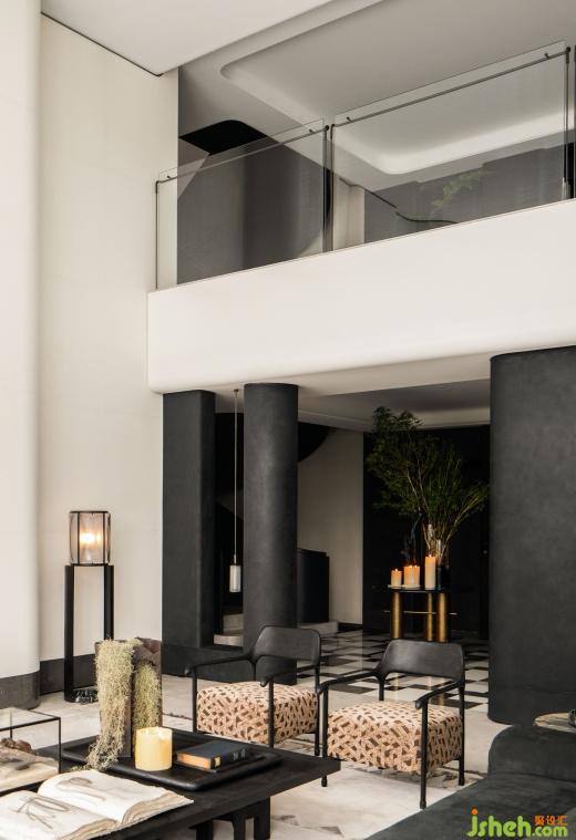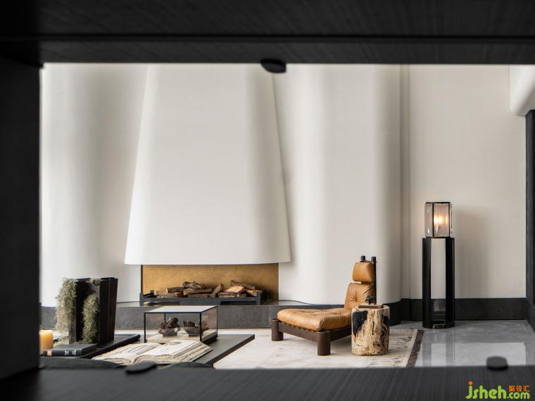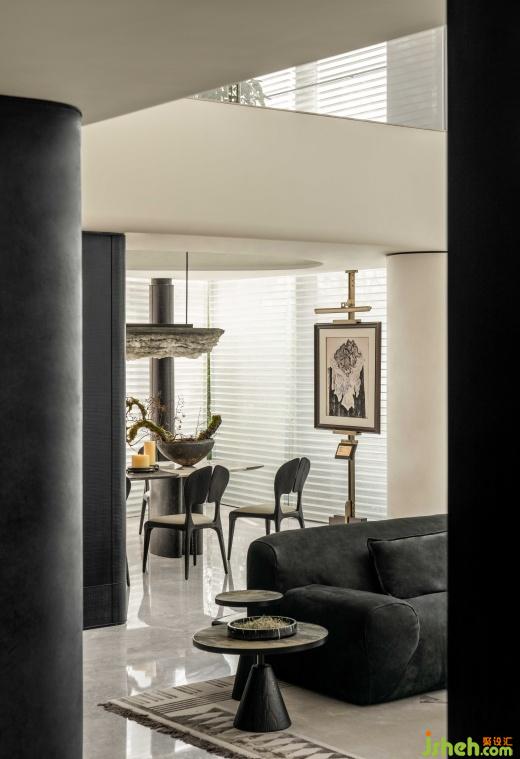 利用豐富的天然材料和工業(yè)技藝,將自然與藝術(shù)完美融合。黑色金屬漆的厚重、人造石的視覺沖擊、絲絨的奢華柔和,織就豐富感官的空間體驗。建筑塊面與家具線條相呼應(yīng),黑與白相互依存,光就像是這個“劇臺”的舞者,引領(lǐng)人進入這場力量與靜謐交織的劇中。
