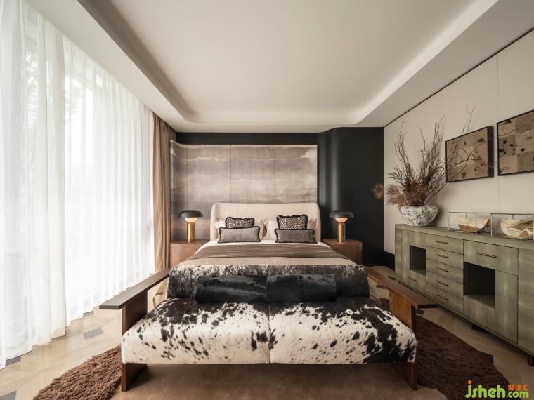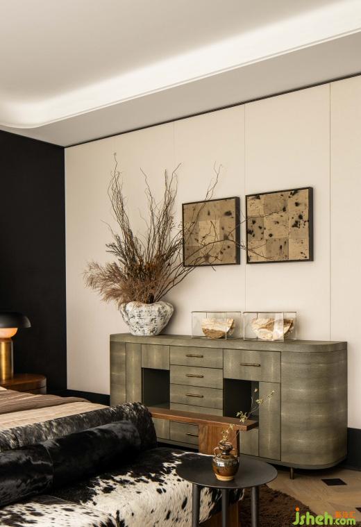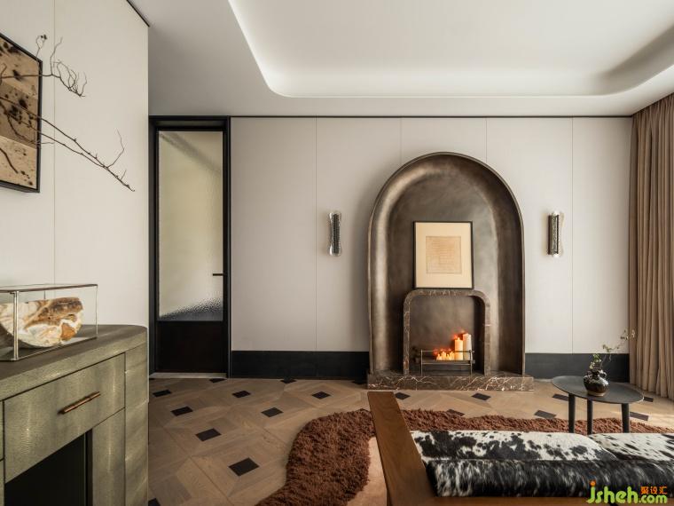 主臥在穩(wěn)重大氣之余兼具靈動自由感。雪花馬毛的床尾沙發(fā),珍珠魚皮與金屬結(jié)合的邊柜,腐蝕銅質(zhì)感的壁爐帶來了奢華的觸感,而壁爐上放置的男主人寫給女主人的信及有機蔓延的地毯形態(tài)則賦予了不少浪漫氣息。