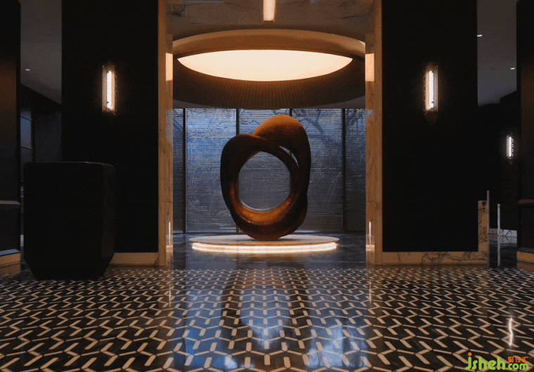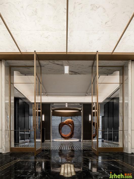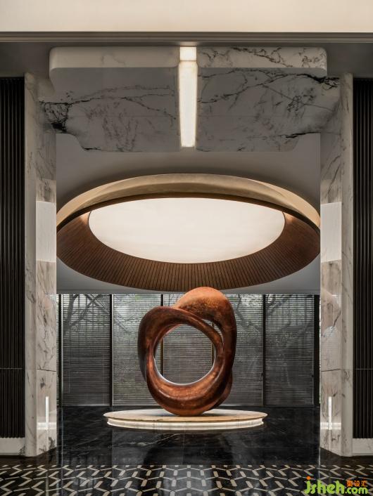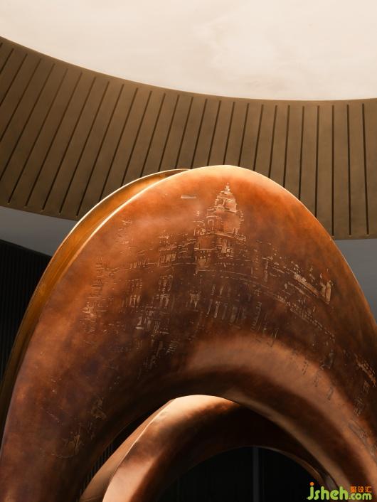 會所設(shè)計金色穹頂下的藝術(shù)雕塑裝置,巧妙融入蘇州河的元素與文化,環(huán)形符號寓意著時間的輪回、城市的變遷與文化的積淀,在時間的年輪中留下深刻印記。