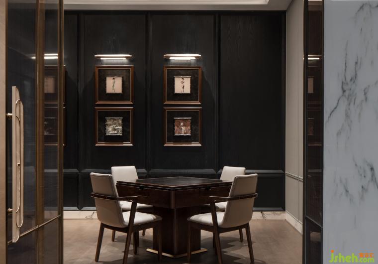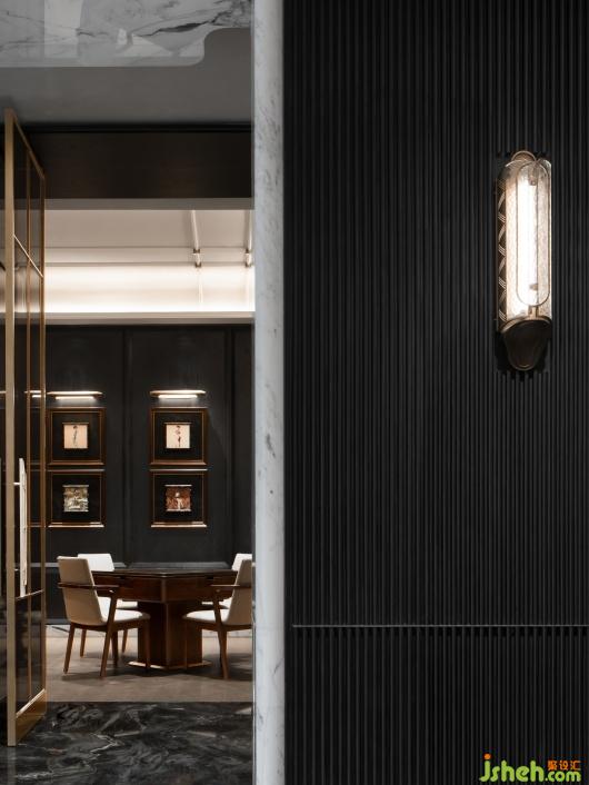 棋牌室用黑色的肌理與深棕色的木紋相互呼應(yīng),將旗袍面料和實物裝飾成畫,高貴而典雅,考究中顯露出萬物靜默的內(nèi)核,深而沉的空間充滿著故事感。
