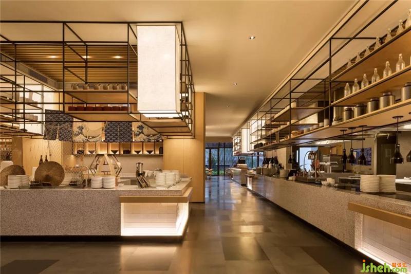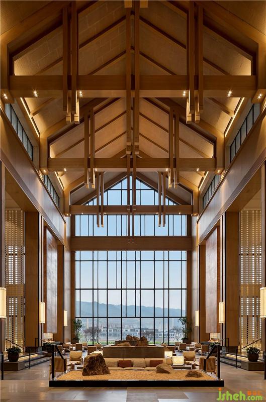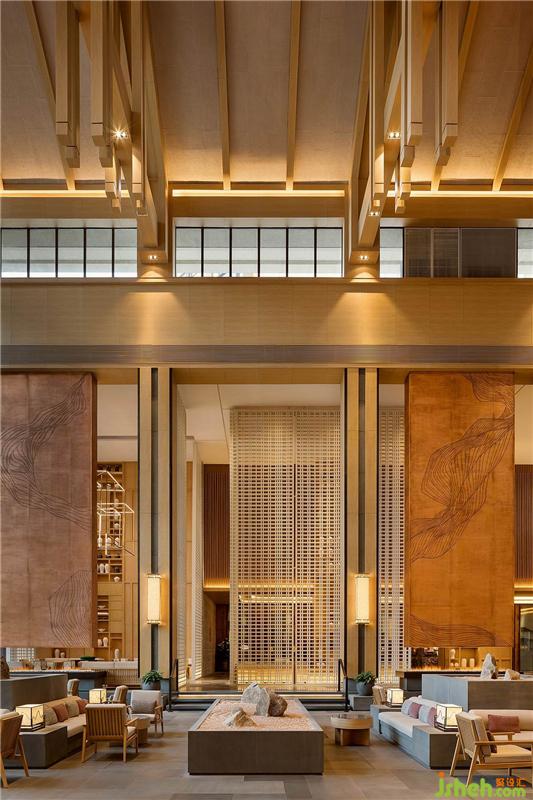 酒店大堂因土建較高,天花又為斜面,最高點接近13米,為解決超高的空間尺度感,YANG從中國傳統建筑中獲取靈感,用具有自然肌理的木紋鋁板在天花構建區(qū)別于傳統形式的木梁結構,增強空間建筑感,又盡顯休閑度假風情。酒店設計