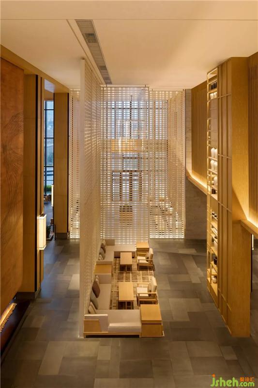“楊柳又如絲,驛橋春雨時”,春雨滋潤萬物,是一切生命的開始。遠看似煙、如霧,如仙境般柔和與淡白。大堂作為酒店的序幕,YANG以春雨為空間設計靈感,將天花連接地面的白色柵格屏風錯落分置,似有形又無形,讓空間通而不透,形成若隱若現的悠遠意境。令每一位步入大堂的賓客,仿若聽見淅瀝瀝的春雨,唱著萬物復蘇的生命之歌,帶來清新自然的空間體驗感。酒店設計