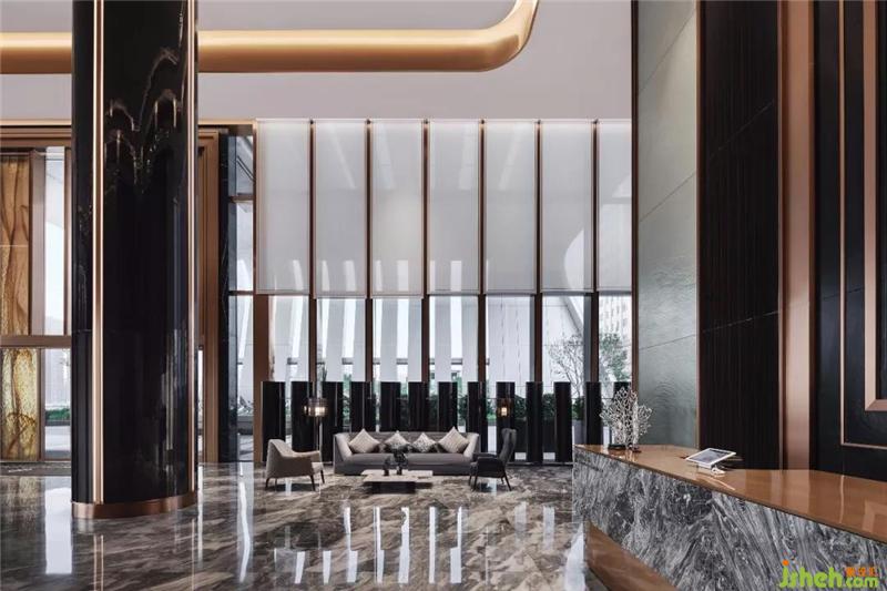 大堂空間簡約大氣,大面積大理石自然的紋理引入海浪奔騰激蕩之磅礴氣勢,前臺(tái)、咨詢臺(tái)、兩組沙發(fā)呈中軸對(duì)稱分布,營造簡潔和諧之美。