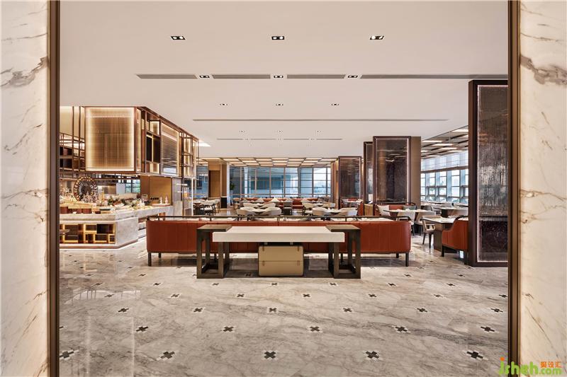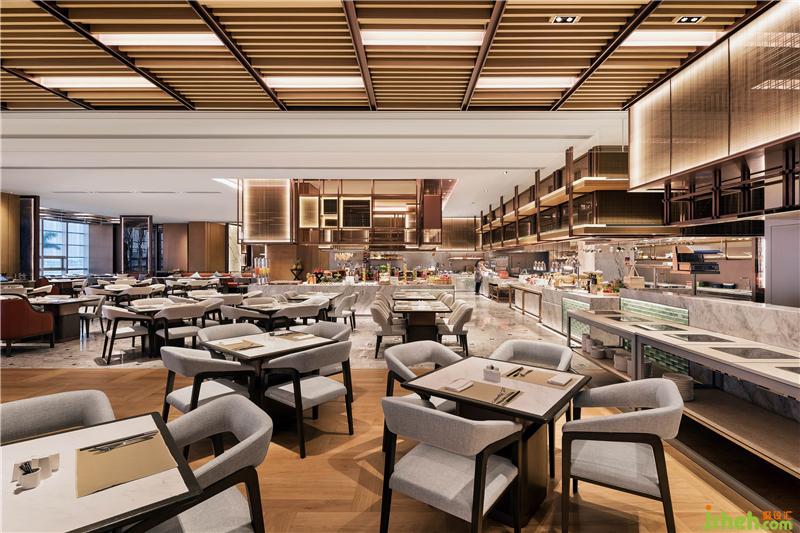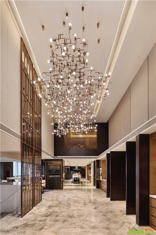 行政酒廊充分結(jié)合建筑本身的飄帶傾斜角,以原木跌級(jí)造型設(shè)計(jì)天花,營造深淺有序的變化美。
