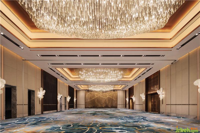 浪漫氣息被延續(xù)到宴會(huì)廳的設(shè)計(jì)中。天花垂落的水晶燈,凝固漁網(wǎng)打撈時(shí)水珠滴落的唯美瞬間,燈管末端散發(fā)的柔和光芒,似無數(shù)珍珠匯聚流溢出的瑩潤珠光。墻面的裝飾水晶燈,以漁網(wǎng)撒開時(shí)的飄逸造型,增強(qiáng)空間的藝術(shù)氣質(zhì)。裝修設(shè)計(jì)