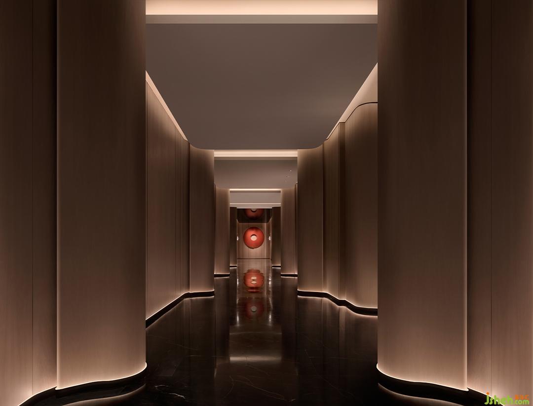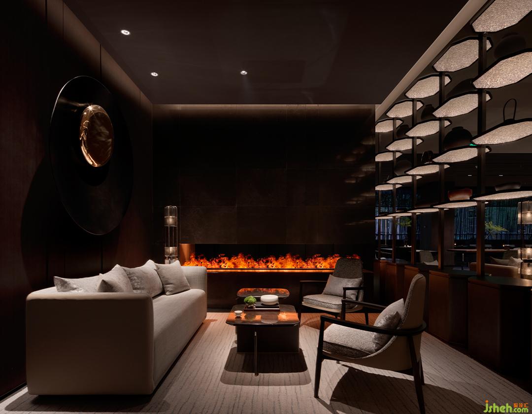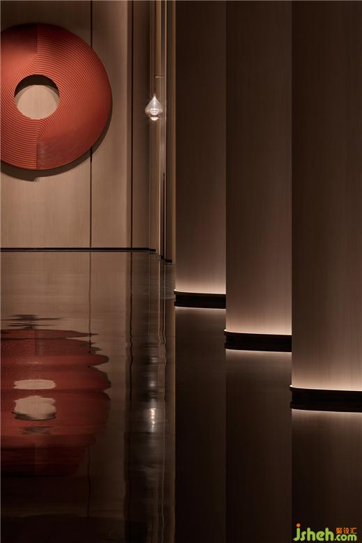 上海酒店設(shè)計(jì)以墻為大潮,奔涌,拍岸。燈是浪尖閃耀的光。魚群風(fēng)暴匯聚空中,攪動(dòng)無(wú)形之海??偱_(tái)默然矗立,后方旭日正東升——宣紙覆疊亞克力上,潑墨赤霞、朱砂……捎帶印象派的毛邊。