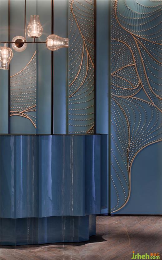 特別設(shè)置嵌入式壁爐,火焰躍動(dòng)長夜,靜謐無聲燃燒,宜圍爐品茗,或文學(xué)沙龍?;⌒文緣ρ由熘岭娞輳d,如游園小徑曲折幽邃,赤色玉璧上水紋旋轉(zhuǎn)相生,以文人之雅,禮迎中外。