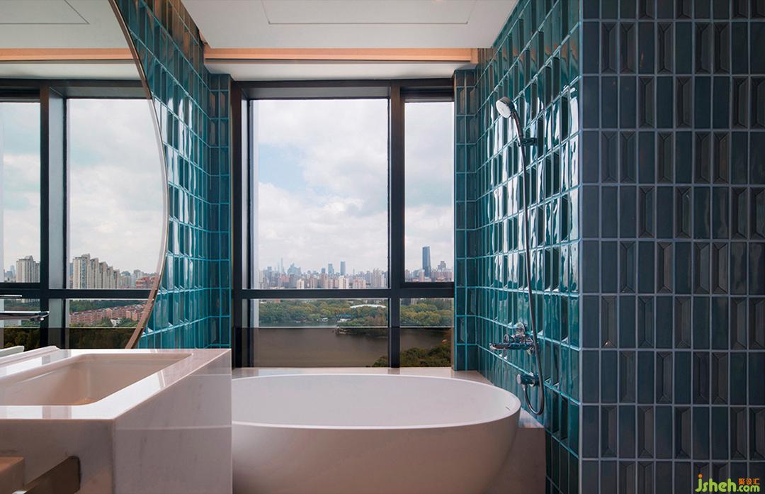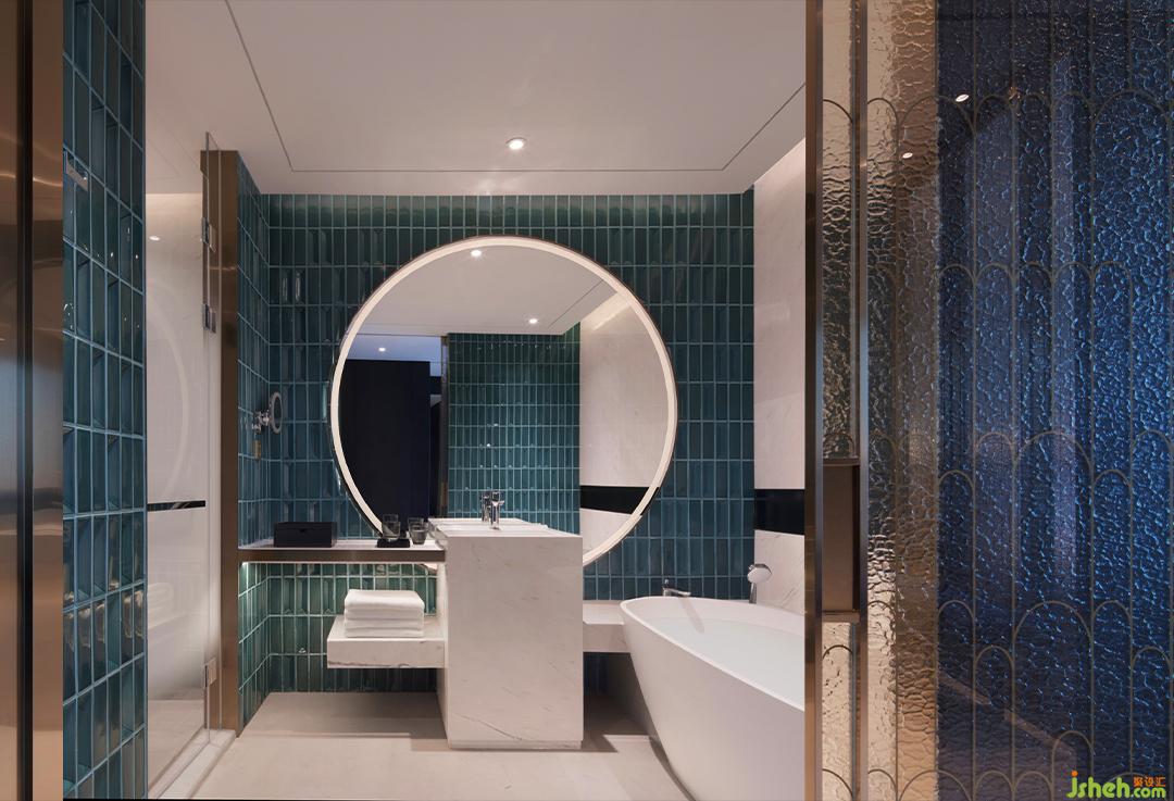 獨(dú)具匠心的衛(wèi)浴區(qū),菱格陶磚墻次第鋪展,新月鏡懸浮正中,上海酒店設(shè)計(jì)搭配由古典家具演變的條案臺(tái),似湖漾山水翠,星月滿銀暉;又似春深庭院里,隔窗弄青梅,暗藏?zé)o限生動(dòng)氣韻。