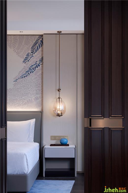 客房彌漫著當(dāng)代美學(xué)的中性基調(diào),家具造型簡(jiǎn)約,粼粼湖光游走地毯、隔斷,葉脈飄飄揚(yáng)揚(yáng)撒落床前,無縫銜接長風(fēng)公園曼妙景致。更因地制宜,部分客房創(chuàng)造性地引入島臺(tái)設(shè)計(jì),既巧妙分隔空間,又是簡(jiǎn)約新潮的盥洗之處。
