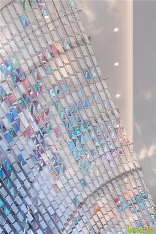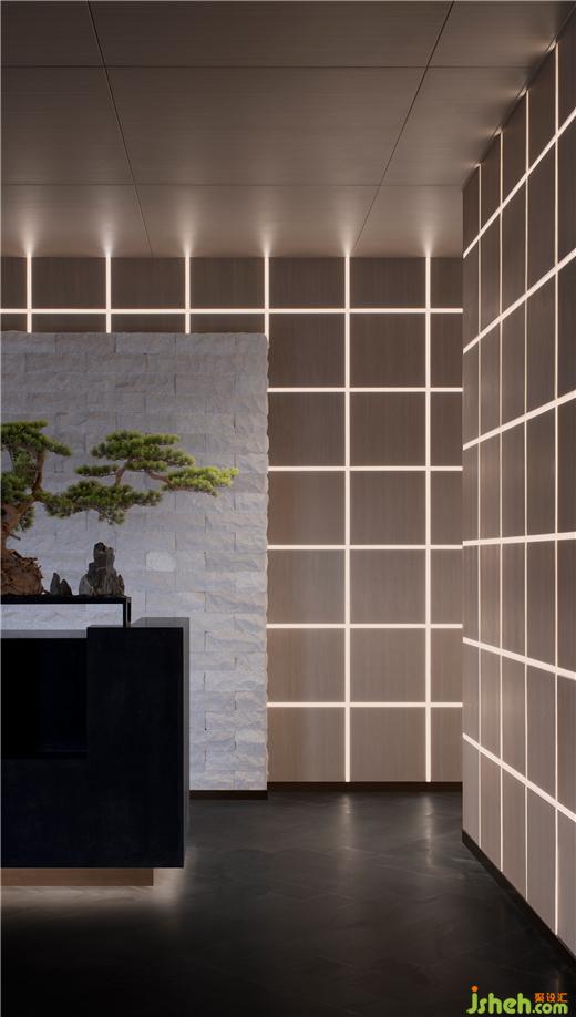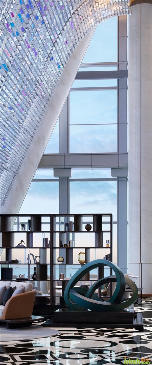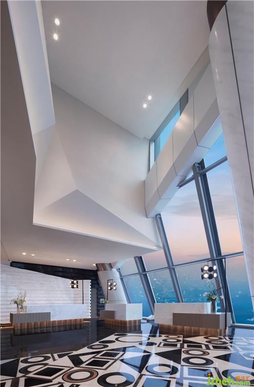 穿越都市叢林,直達(dá)天幕大堂。均質(zhì)雅白的立體折面天花,為14米極致層高的狹長空間引入豐富變化。線性墨色石材墻面從抵達(dá)廳延伸至大堂,如軌道堅定朝向遠(yuǎn)方。源自枕木靈感的藝術(shù)品懸浮一側(cè),躍動斑斕虹光。
