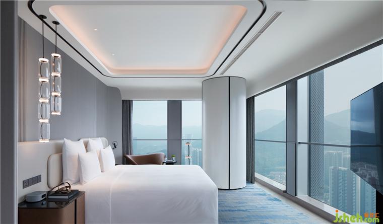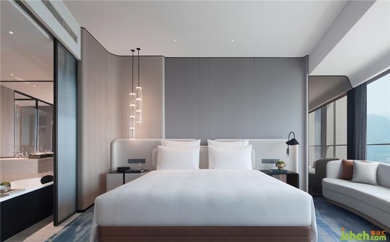 客房現(xiàn)代簡(jiǎn)約,弧形天花、清雅設(shè)色與有機(jī)線條的家具創(chuàng)造出溫柔的包裹感,深圳酒店設(shè)計(jì)隱喻豪華車廂及鉑爾曼的品牌起源,亦帶來靜謐溫馨的感受。