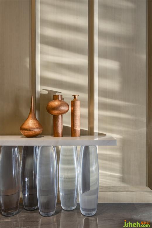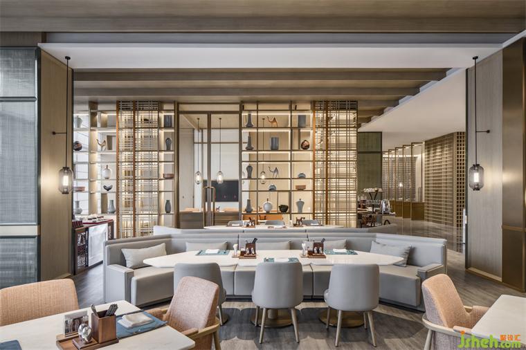 特別研發(fā)的長(zhǎng)案茶臺(tái),有序陳列著精致茶器,禮迎高朋逸客。秋香色斑駁煙柳,圍合荼白陶器,西安浐灞華邑酒店設(shè)計(jì)使人不經(jīng)意間放松下來(lái)。陽(yáng)光澄澈,柳色鎖不住,茗香越墻來(lái)。