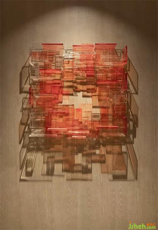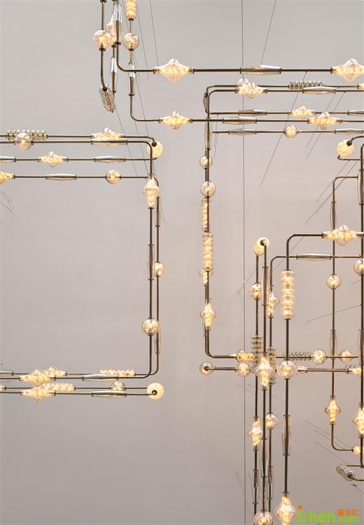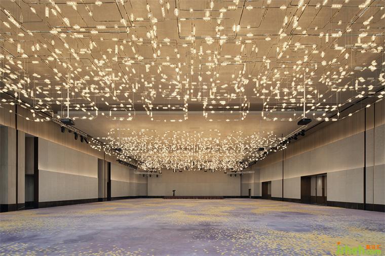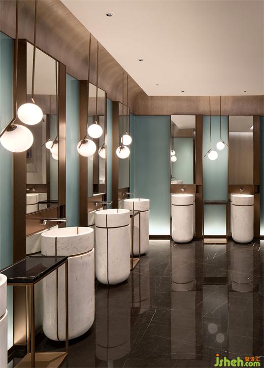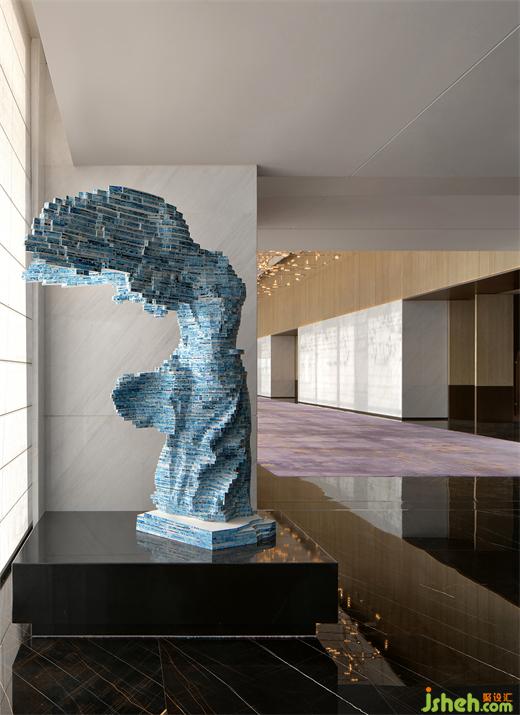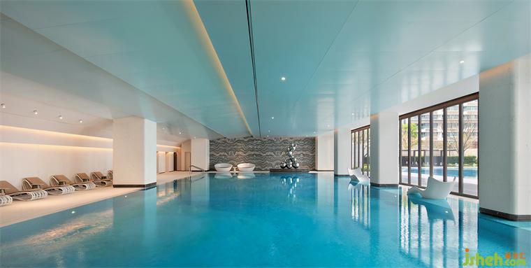 泳池的無邊際設(shè)計和藍色水面讓人仿若置身大海。端頭一座以水氣泡為設(shè)計原型的現(xiàn)代雕塑,金屬鏡面球體大小不一的疊加錯落,希爾頓酒店設(shè)計映射出墻面深色大理石的「波浪紋」,同時與波光瀲滟的水面形成動靜相宜,讓空間更顯活力。