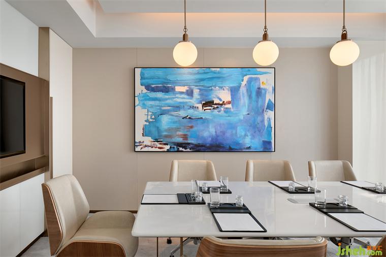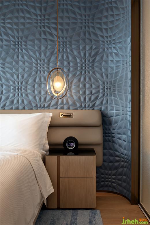 希爾頓酒店設計套房以靜謐藍為主色,輔以優(yōu)雅的米灰色,營造安寧舒適的體驗感。藍色墻面&桌臺和極簡燈具的創(chuàng)意組合靈感源于「藍色海面的星光熠熠」。