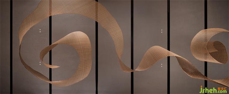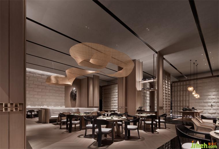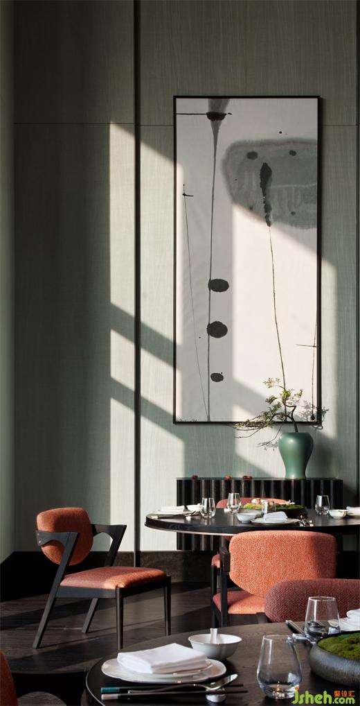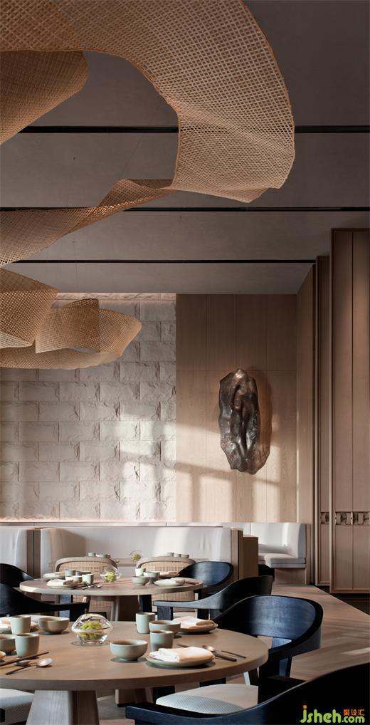 特別引入的素食餐廳,整體設(shè)色清雅,用材樸拙。懸浮的藤編藝術(shù)品、淺灰色仿原石、木紋鋁板編織格柵,一切素樸自然。別具一格的包房設(shè)計(jì),似一個(gè)個(gè)獨(dú)立盒子,散落于翠意盈盈的景觀帶,將餐廳與過(guò)道間的2.7米層高落差,轉(zhuǎn)換為錯(cuò)落有致的暗藏驚喜。