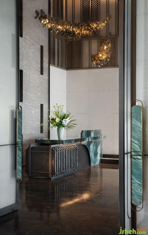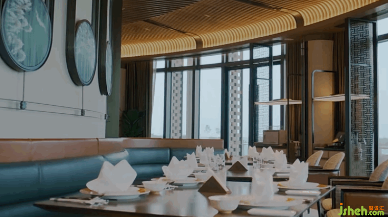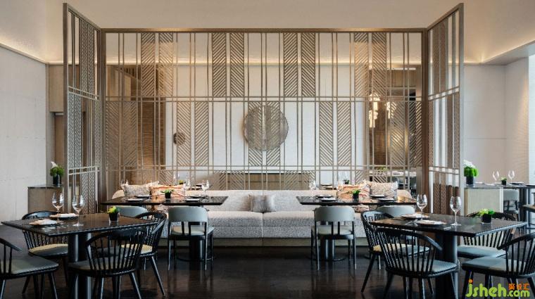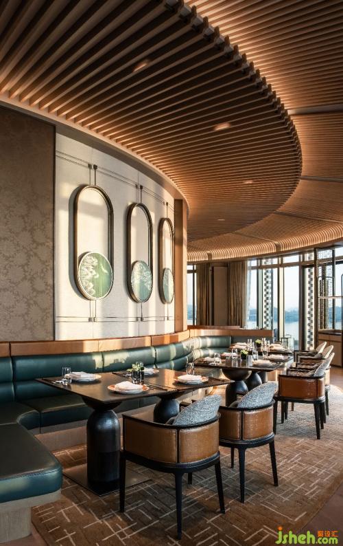 越過水景小園,步入全日餐。疏朗開闊的空間里,線與面交織出美的韻律。豎條御窯金磚或有序嵌入墻面,或穿插翡翠紋理接待臺。太平船模解構(gòu)再譯,褐鐵色碎片攢動(dòng)點(diǎn)點(diǎn)漁火凌空,恍然踏入水巷楓橋。
