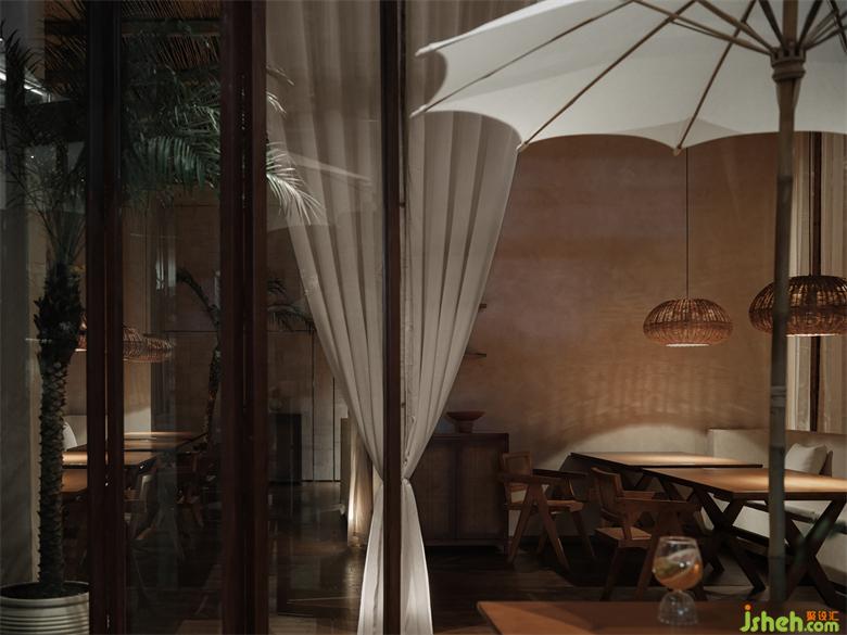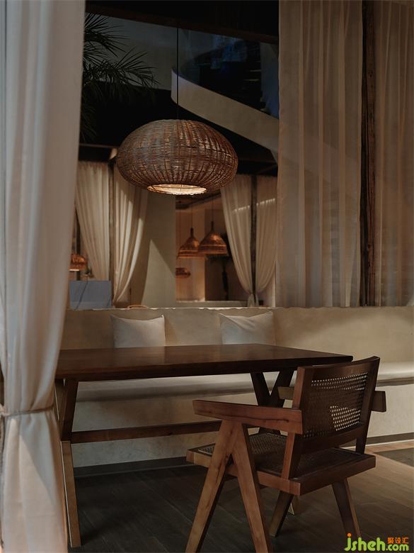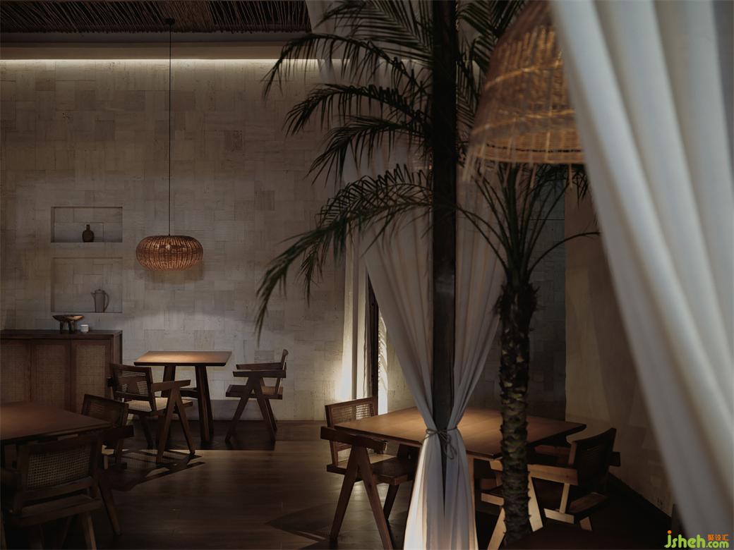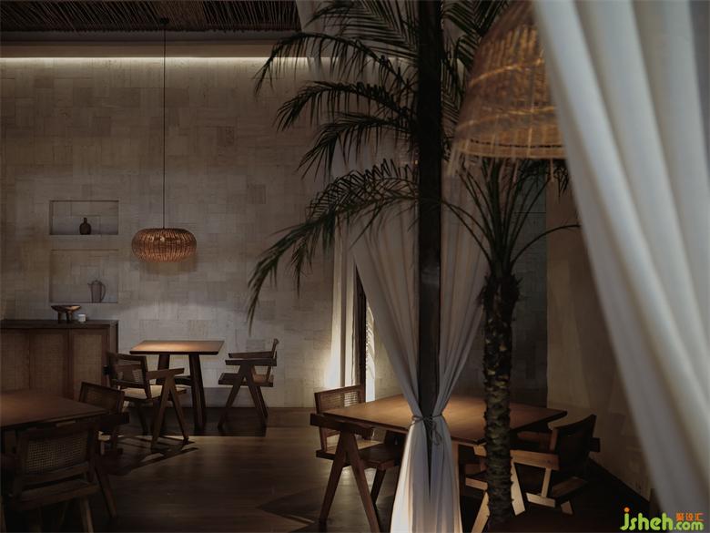 紗幔頂部的蘆葦桿屋頂,除了增添空間的自然質(zhì)樸質(zhì)感之外,亦是一種可持續(xù)性的設(shè)計(jì)實(shí)踐。泰爽餐飲設(shè)計(jì)讓一切交織在一起,形成一幅靜謐舒適而又清新自然的浪漫寫意畫。