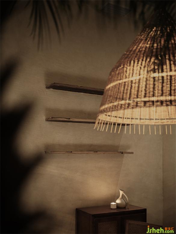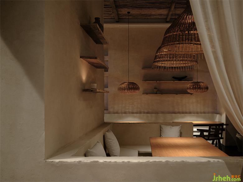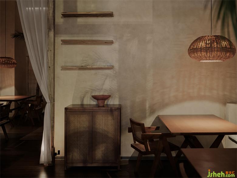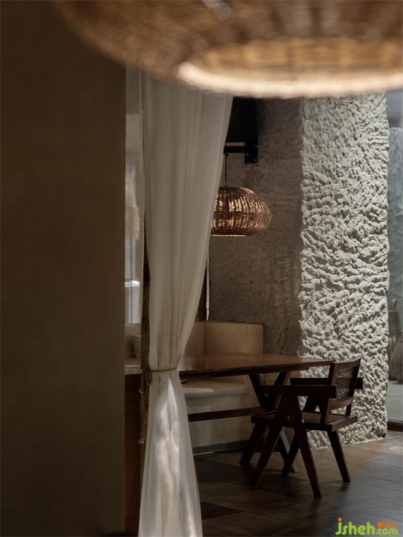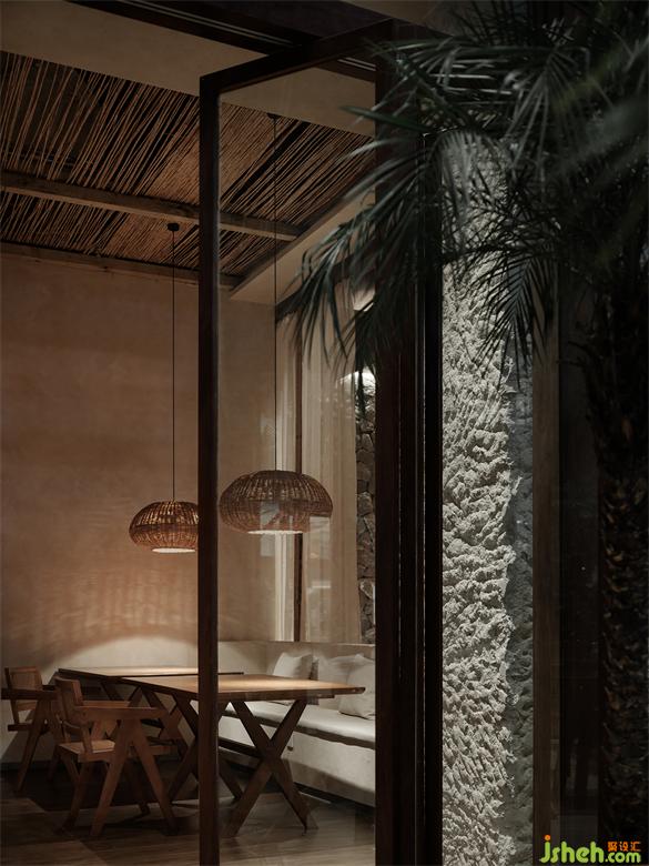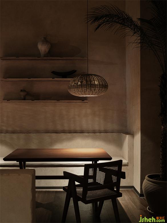 After passing through the wooden porch and outdoor seating area, entering the interior space, the entire space is wrapped in a mild sand-colored inorganic gray plaster wall. The slightly yellowish light shines through the gaps in the rattan lamps, leaving thin and long textures on the wall. The alternating separation and connection of different space areas balance the essential needs of privacy and openness in the restaurant.