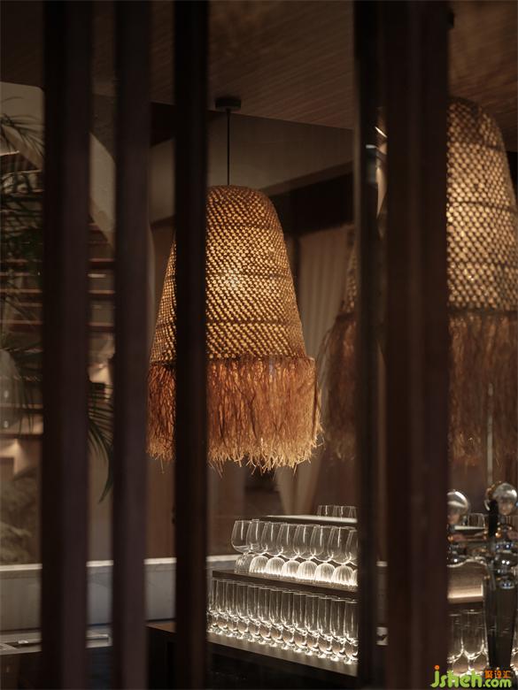 穿過(guò)木質(zhì)門廊和外擺區(qū)域,進(jìn)入空間內(nèi)部,泰爽餐飲設(shè)計(jì)整個(gè)空間被溫和的沙色無(wú)機(jī)灰泥墻包裹。微黃的燈光透過(guò)藤編燈的空隙,在墻面印上一條條細(xì)長(zhǎng)的紋理。空間區(qū)域分隔和聯(lián)系的交替,更多的是平衡餐廳私密與開(kāi)放的本質(zhì)需求。