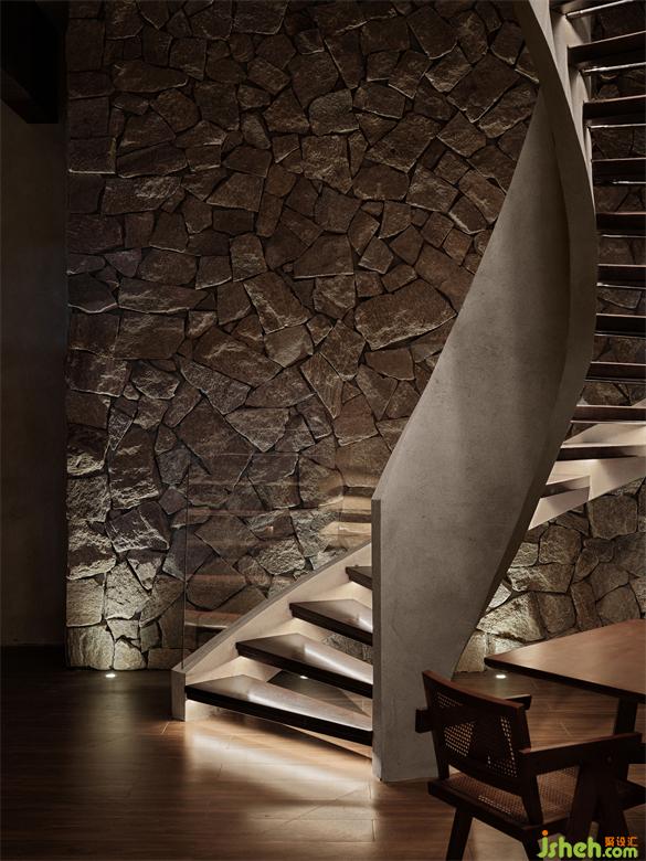 Materials are a deep desire for memory, a sense of identity with culture, scene, and life structure that arises from the tearing of post-modern culture. The rough stone walls are intertwined with the elegantly shaped spiral staircase, creating a clever contrast of thickness and fineness in the space.