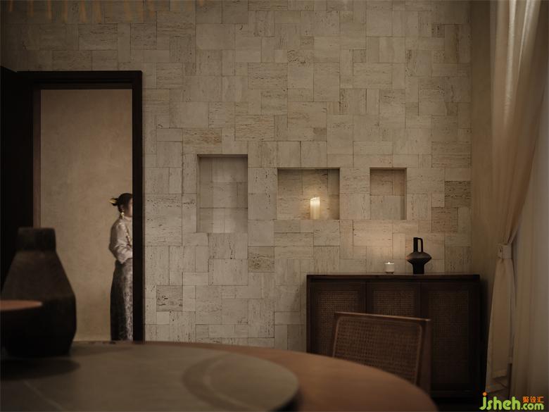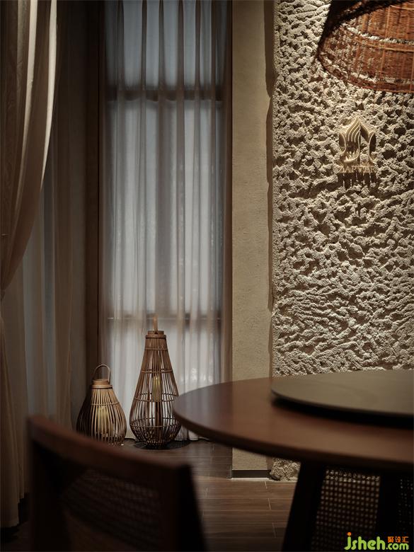 包間內(nèi)一邊是肌理豐富的拼接石墻,一邊是顆粒感十足的石板,在均勻的洗墻燈照射下,呈現(xiàn)出獨(dú)特的光影紋理。