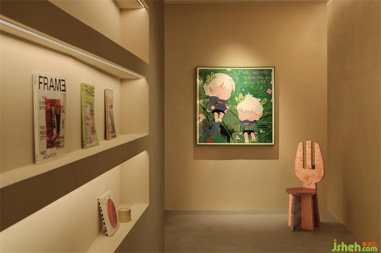Right next to the entrance, the linear space guides us into a small area surrounded by soft colors, and there is a feeling of wanting to keep moving forward and exploring the next adventure. A tranquil experience unfolds in the foreground where the green paintings hanging on the wall are combined with gentle colors. Welcome to "Aurora's Dreamland"!