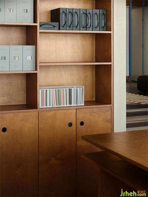 辦公室設(shè)計(jì)師把墻面設(shè)計(jì)成書柜的模式,將每一次的“靈感時刻”安放在此處,用不同的裝置藝術(shù)刺激感官與心靈,在閱讀與交流中碰觸每一次的靈光迸發(fā)。