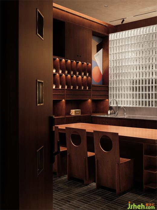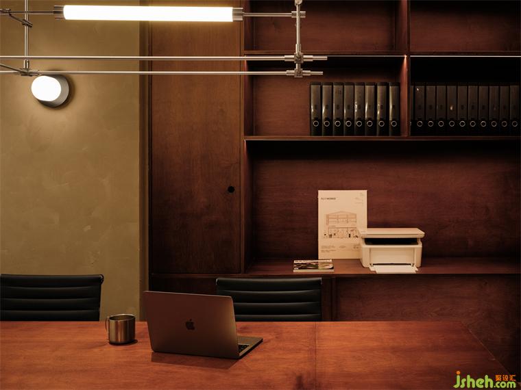 靠玻璃磚墻部分有一個(gè)閉合的柜面,日常雜物都可以收納至此。另一部分為開(kāi)放式書(shū)柜,簡(jiǎn)單的框架可以容納多種語(yǔ)言,既可以放置日常辦公的文件,又可成為打印復(fù)印的操作臺(tái)。