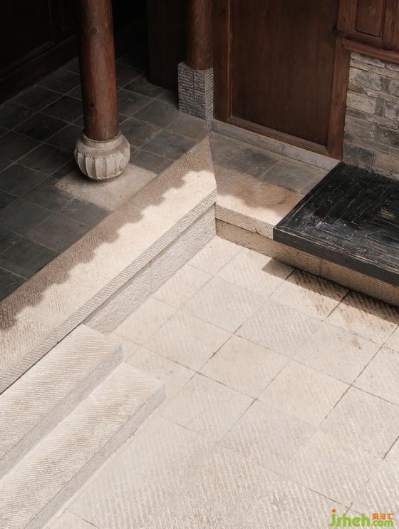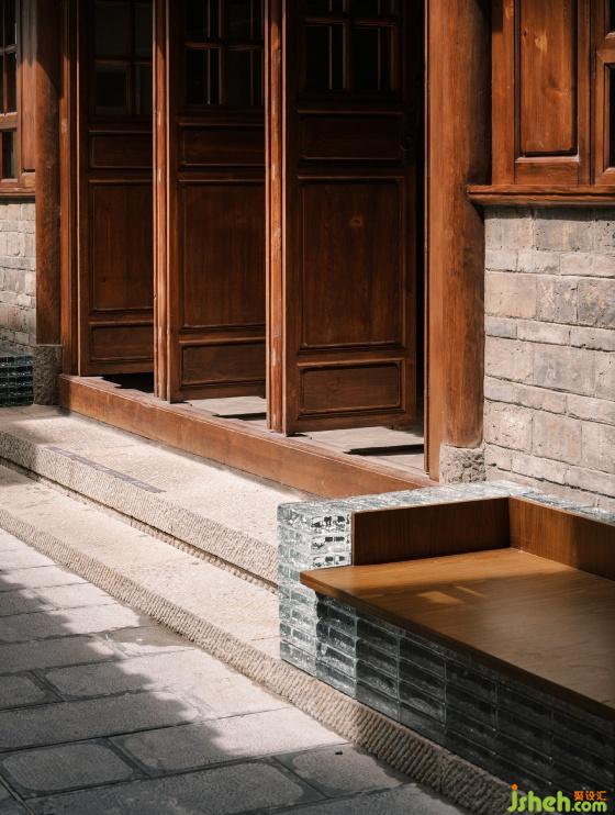 入口,深木色的走廊,在陽光的蔭翳處引誘感官,深邃而充滿期待;一方水池,豢養(yǎng)一方天地,陽光隨著水波呼吸、流動,魚尾翻打出靈動的生命呼吸。穿過幽幽走廊,豁然一片天地,肆意閃耀的陽光,原磚的青石板面,摩挲出古樸記憶的回響,踢踏步履間,細嗅自然綠意。