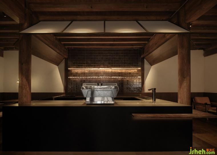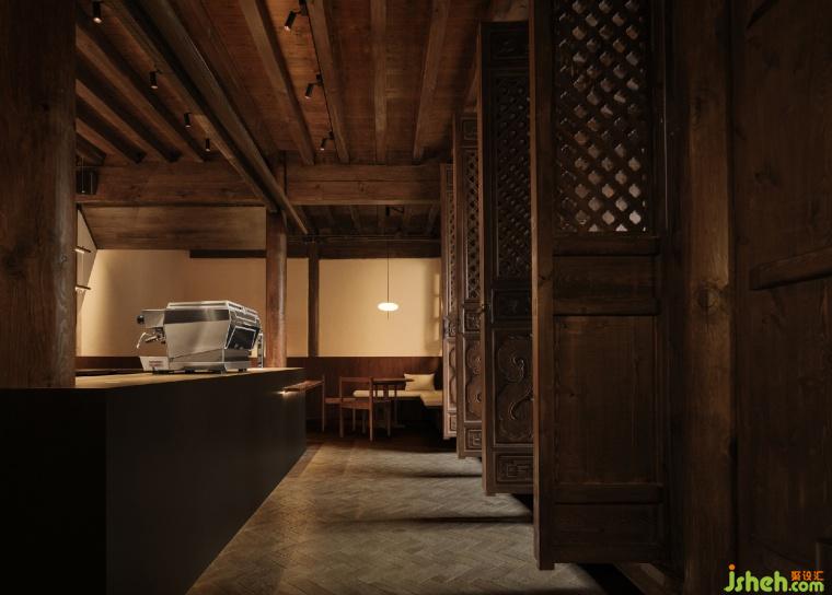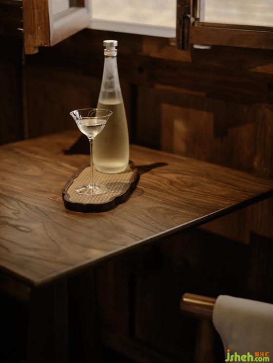 院落的南側,是餐廳的墨黑色吧臺,素凈簡潔的造型,搭配古舊的陳木廊柱,在暖色調的燈光下露出時光的溫柔余韻,低調黝黑的亮面瓷磚,在滿目琳瑯的玻璃器皿間跳躍浮動,吸引來客的目光。等待的間隙,老木板留駐與bartender的交流暢聊。散臺區(qū)域將吧臺包圍,三面圍合的格局形式,大大節(jié)省空間動線的時間效率。北側臨街一面,設計師也安排了外擺座椅,給行人和客人提供了停駐、休憩場所。木頭和玻璃磚砌筑而成,清涼與溫軟的張力交織,就像新舊時光的交接,發(fā)出清朗的脆響……