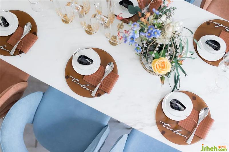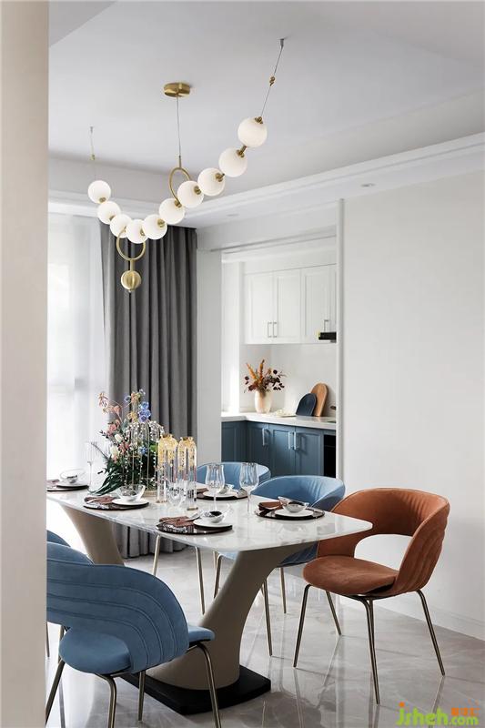 樣板房設(shè)計(jì)師并沒有用生硬的線條分割客餐廳區(qū)域,而是以一個矩形空間使人們的視覺自動劃分開獨(dú)特的餐廳一角,既保持了客餐廳一體的寬闊感,又使餐廳具備一定的私密性,家具的圓潤增添了空間的高級感與流暢性,營造出靜謐舒緩的居住氛圍。