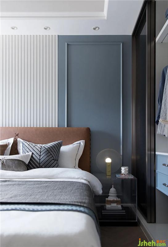 主臥的裝飾面沿用法式經(jīng)典元素,倍顯法式調(diào)性:沉穩(wěn)、大氣、精致,加上具有設(shè)計(jì)感的邊幾,軟裝與硬裝相呼應(yīng),在一定程度上為空間潤色不少。