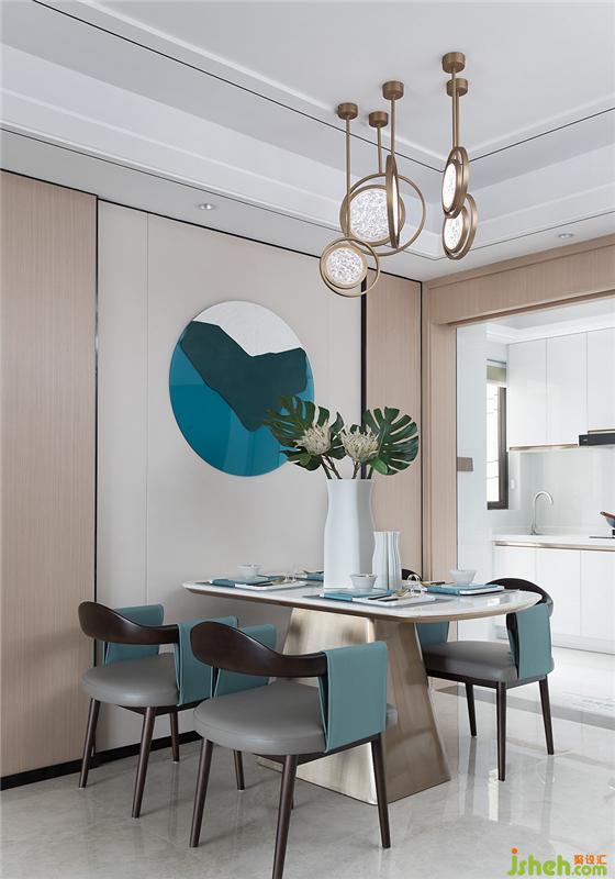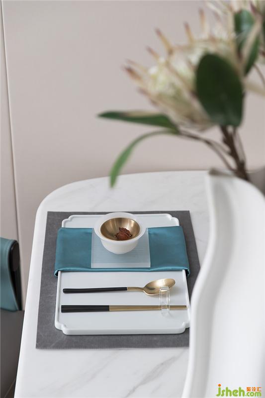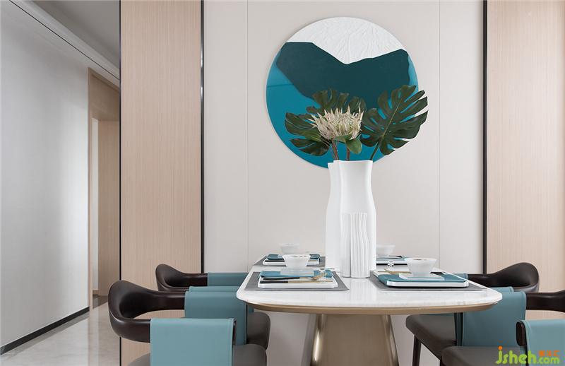 餐廳與客廳相通相融,清風(fēng)穿堂而過(guò),吹皺畫上春水。家具選擇合適的體量與舒緩的造型。淺色石材與深色皮革,加之空間原有的溫潤(rùn)木質(zhì),餐廳在韋美設(shè)計(jì)師的手下勾勒下寧?kù)o而淡泊。