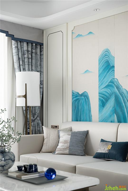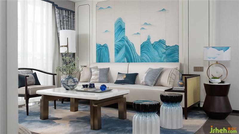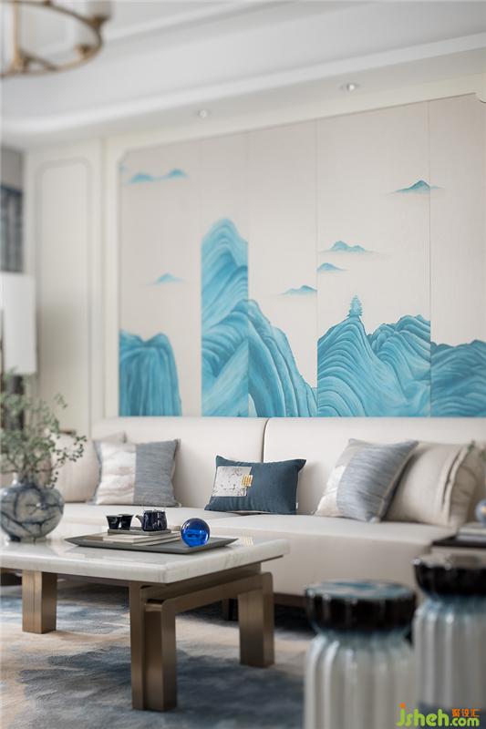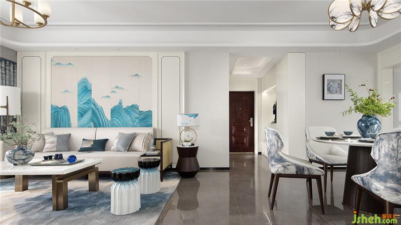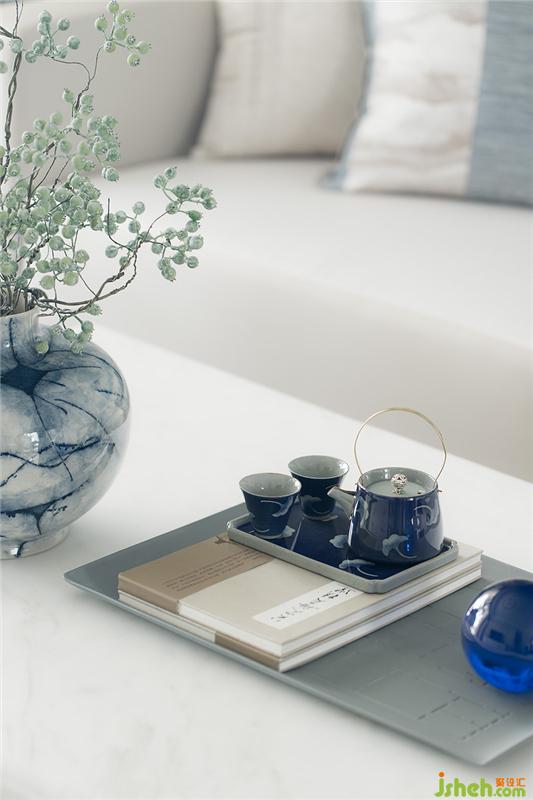 青花瓷始于唐,到了元代工藝純熟。元青花一改歷朝瓷器含蓄內(nèi)斂之風(fēng),其形色大氣,氣勢(shì)雄渾,一舉奪下霸主地位。韋美設(shè)計(jì)師以大氣的青花山水畫展開空間畫卷,客廳家具選型在硬朗與舒適之間或張或馳,青花藍(lán)在大面積留白間穿插暈染,描繪出青花瓷的獨(dú)有魅力。