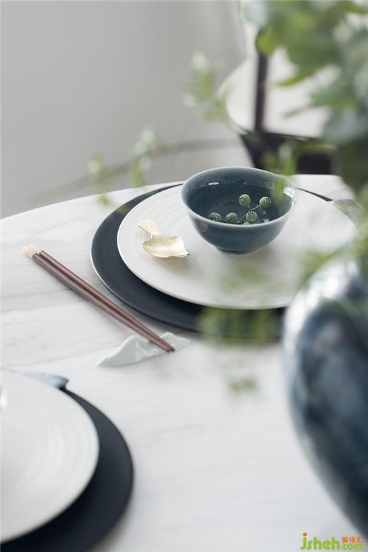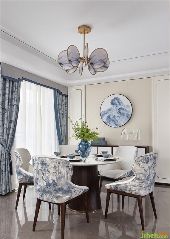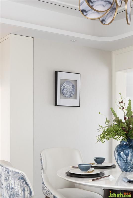 餐廳沿襲了客廳的特色,圓餐桌是中國(guó)家庭更青睞的形體,簡(jiǎn)約的圓桌在青花椅的圍合間彰顯豪放的元青花特色,山巒掛畫下形態(tài)飽滿的蒙古馬閑適自得。