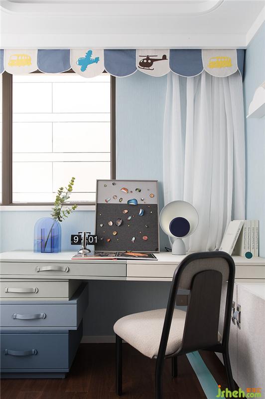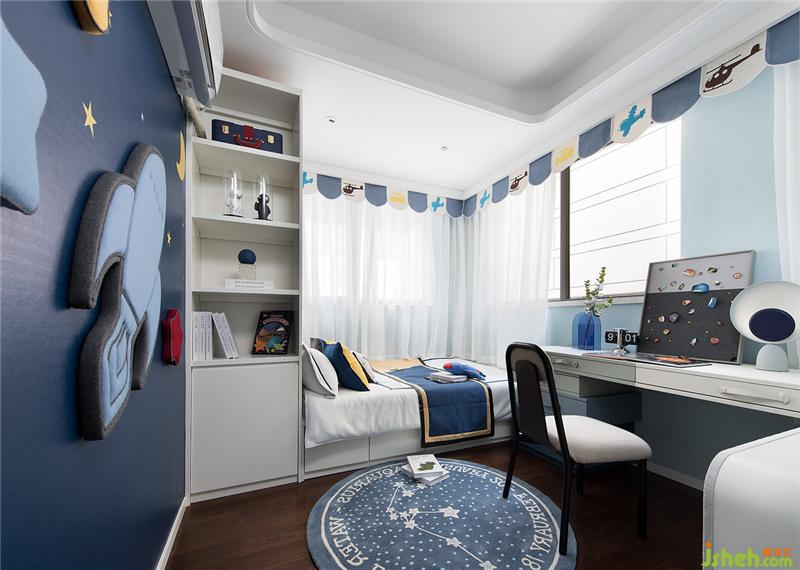 男孩房提取青花藍為主體色,整體基調干凈而現代。設計師充分利用空間。集收納,休息,學習區(qū)域為一體。滿足兒童成長歷程中各個年齡段的全面需求。