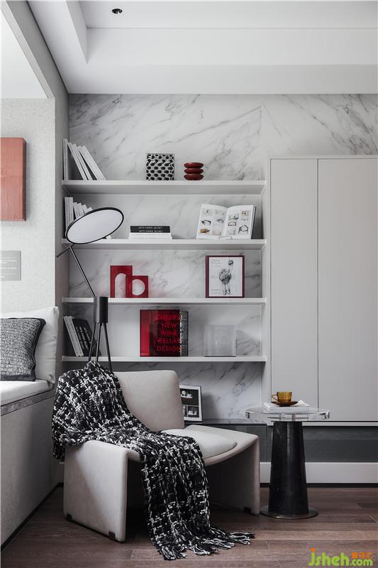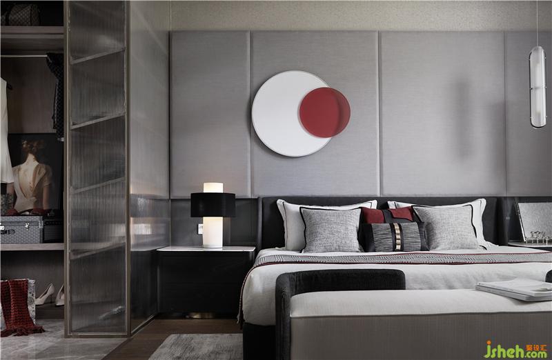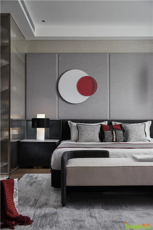 主臥延展的開間使用穩(wěn)重淡雅的灰調(diào),沒有夸張與炫目,而是平淡、溫馨,細(xì)膩地表達(dá)出對(duì)生活品質(zhì)的追求。這是一個(gè)臥室該有的舒適。即使處于閱讀角的一隅,亦關(guān)乎藝術(shù)、傳統(tǒng)大漆器具與現(xiàn)代藝術(shù)家郭天天的作品《朱園》相糅合,成為素雅空間的一抹點(diǎn)睛之筆。
